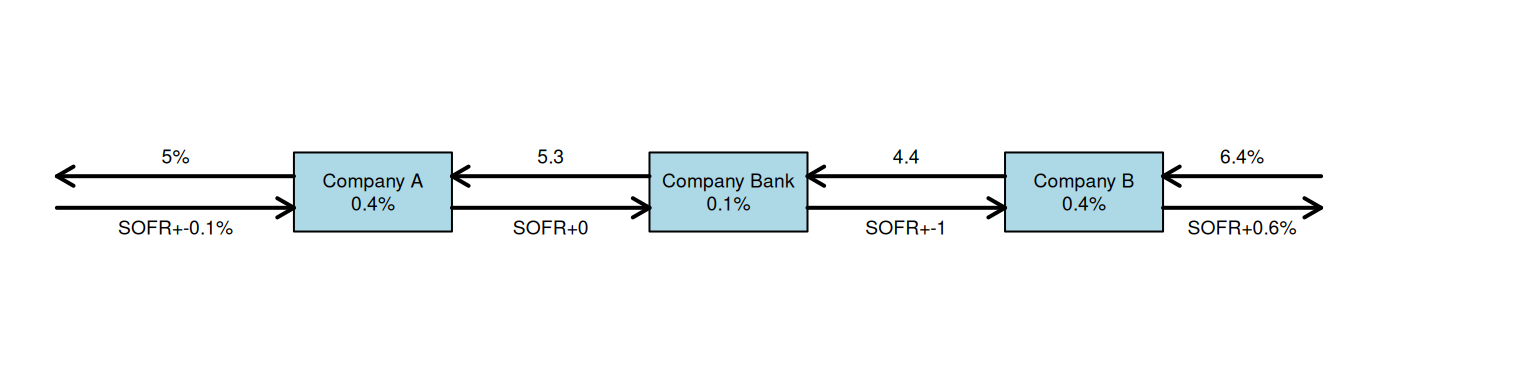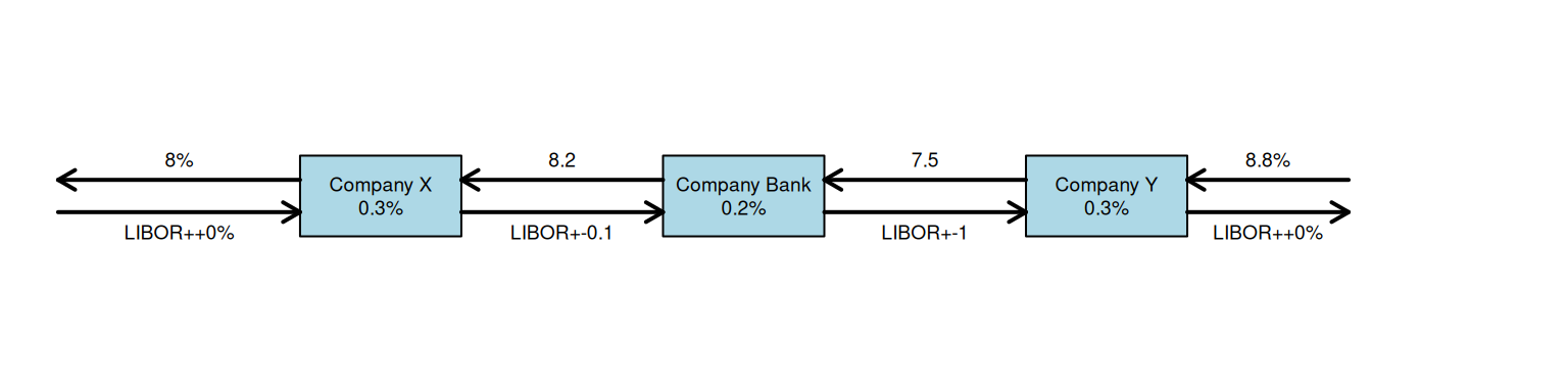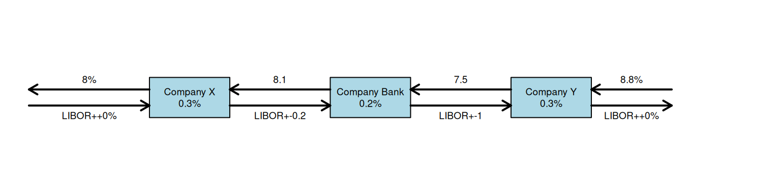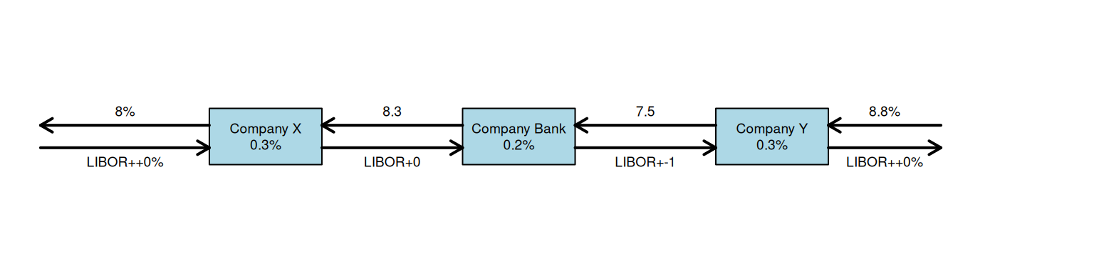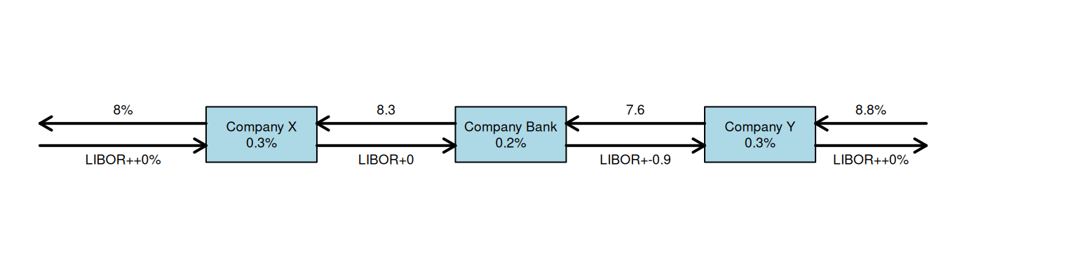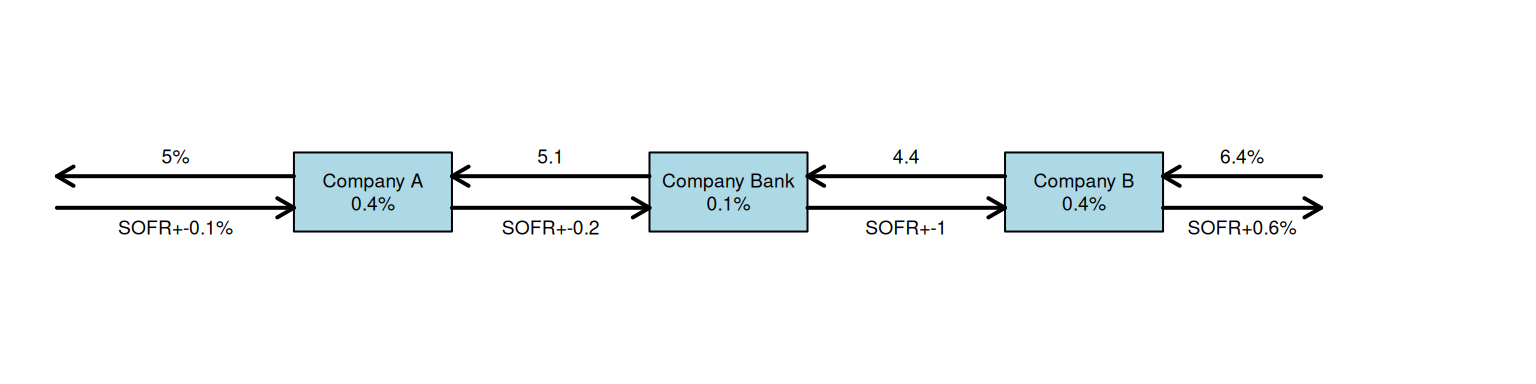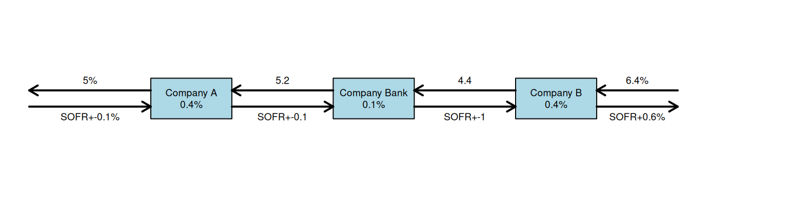 \(s_{Bk-B}\): the spread of credit the bank pays to company B on floating rate;