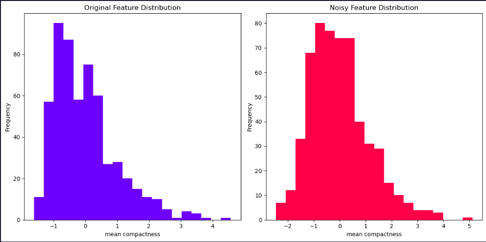 We can get a good idea of how much noise there is in the features by comparing values in the previous tables. We can also visualize the differences in several ways. Let’s begin by plotting the histograms of one of the features with and without noise for comparison.