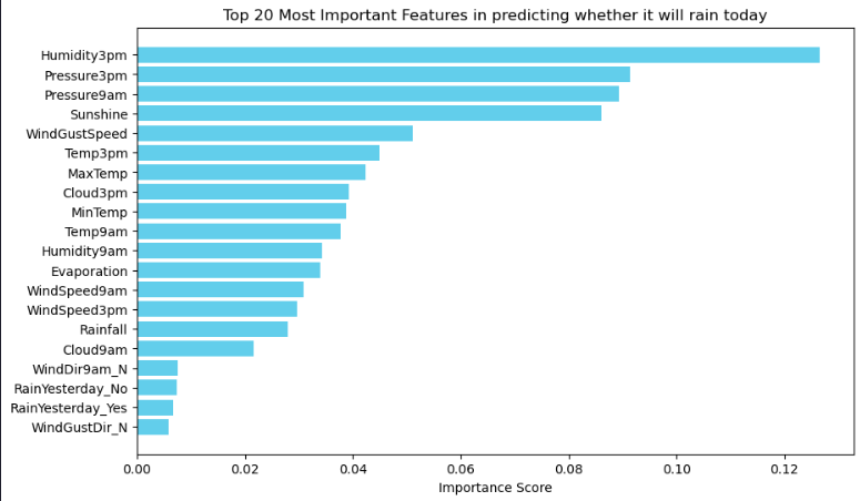 plt.title(f'Top {N} Most Important Features in predicting whether it will rain today')