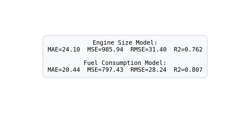 The fuel consumption model generally achieves lower error and higher R² versus engine size—consistent with domain intuition that direct energy use (fuel burned) maps more tightly to emissions than displacement alone.