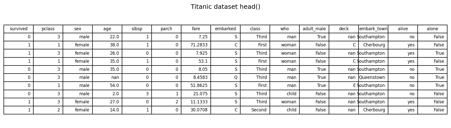 We use the Titanic dataset (via Seaborn). The goal is to predict survived from a set of demographic and ticket features. A sample of the dataset is shown below.