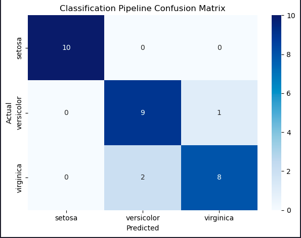 The model incorrectly classified two virginica irises as versicolor, and one versicolor as virginica. Only three classification errors out of 30 irises on our first attempt!