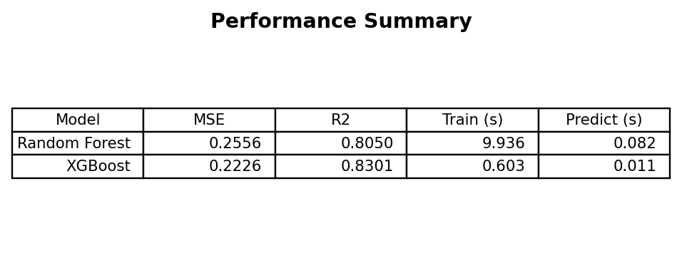 'XGBoost': {'MSE': mse_xgb, 'R2': r2_xgb, 'train_s': xgb_train_time, 'pred_s': xgb_pred_time}
