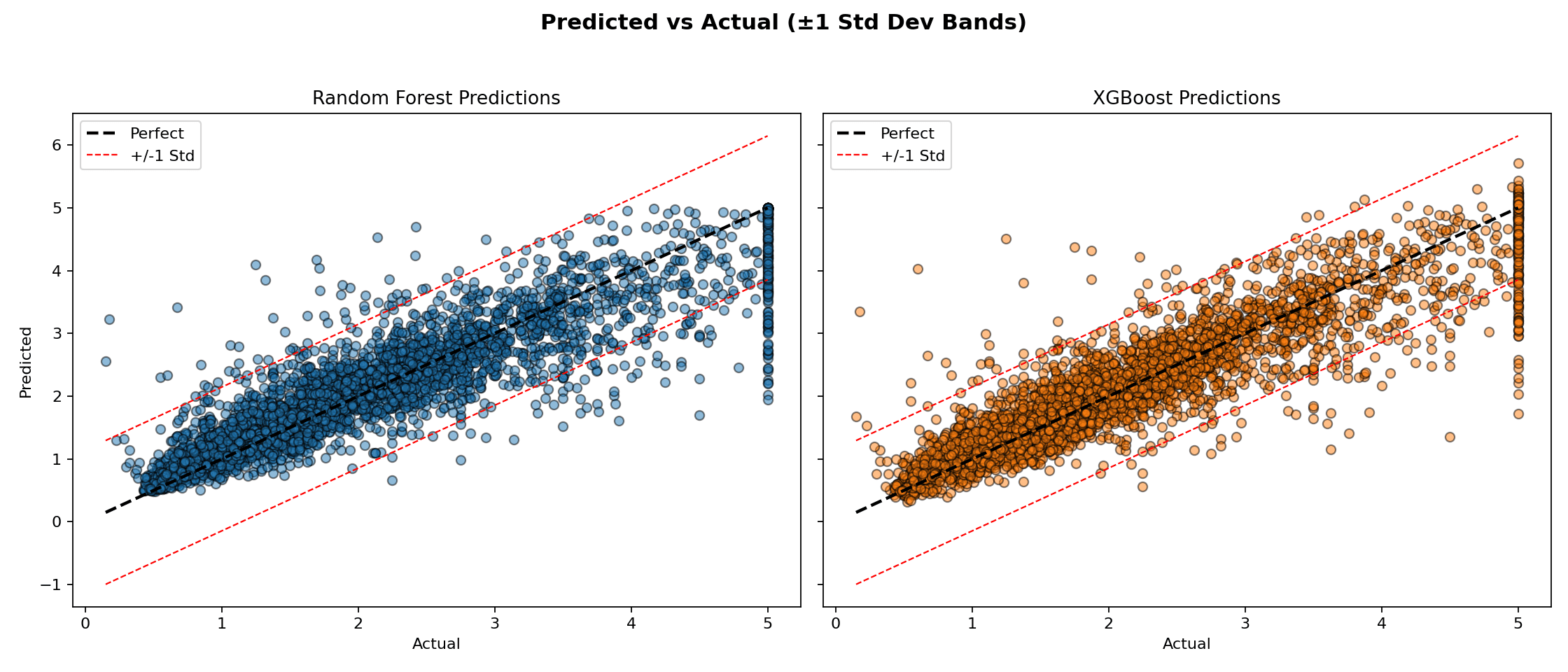 - Error dispersion via predicted vs actual plots with ±1 standard deviation bands